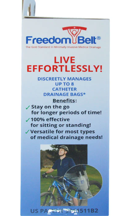 The Freedom Belt is your solution to get your freedom back! If you have to use a drainage bag because of a surgery or condition, you are probably familiar with some of the problems that come with it. This is the first product on the market that is specifically designed to hold ANY drainage bag in place and allows it to move with you comfortably. Traditional bag holders are made of cheap and irritating materials that do not effectively hold drainage bags in place. The Freedom Belt was designed with high quality, fluid resistant, durable materials that are made to be worn, discreetly under clothing, all day without causing irritation or discomfort. Even the belt buckle was made with the patients in mind, featuring a curved, center piece buckle to fit the body comfortably and easy use for patients with limited dexterity.